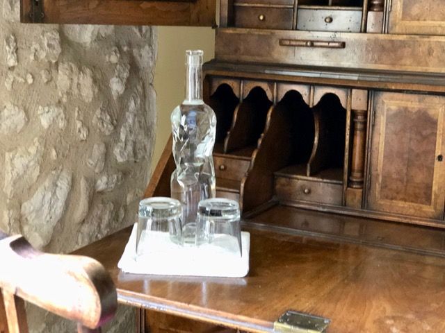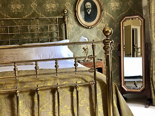La décoration, de style classique, marie un curieux secrétaire anglais, un lit en laiton de 160 cm et un lustre art déco.